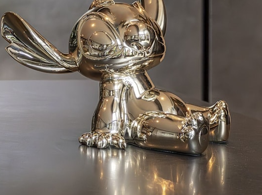 愛嬌たっぷりのスティッチを、ゴールドで華やかに表現した限定オブジェ。